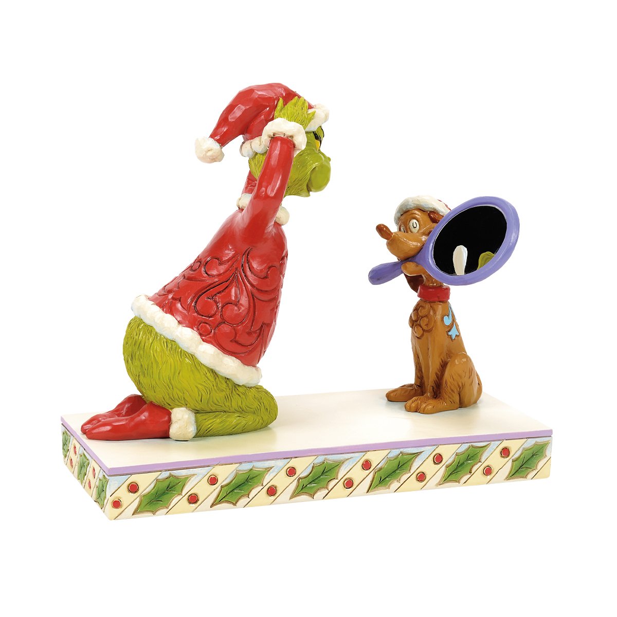 In this Jim Shore figure, the Grinch, dressed as Santa, adjusts his hat while looking at himself in a mirror held by his loyal friend Max. Designed by award-winning artist and sculptor Jim Shore for The Grinch collection.