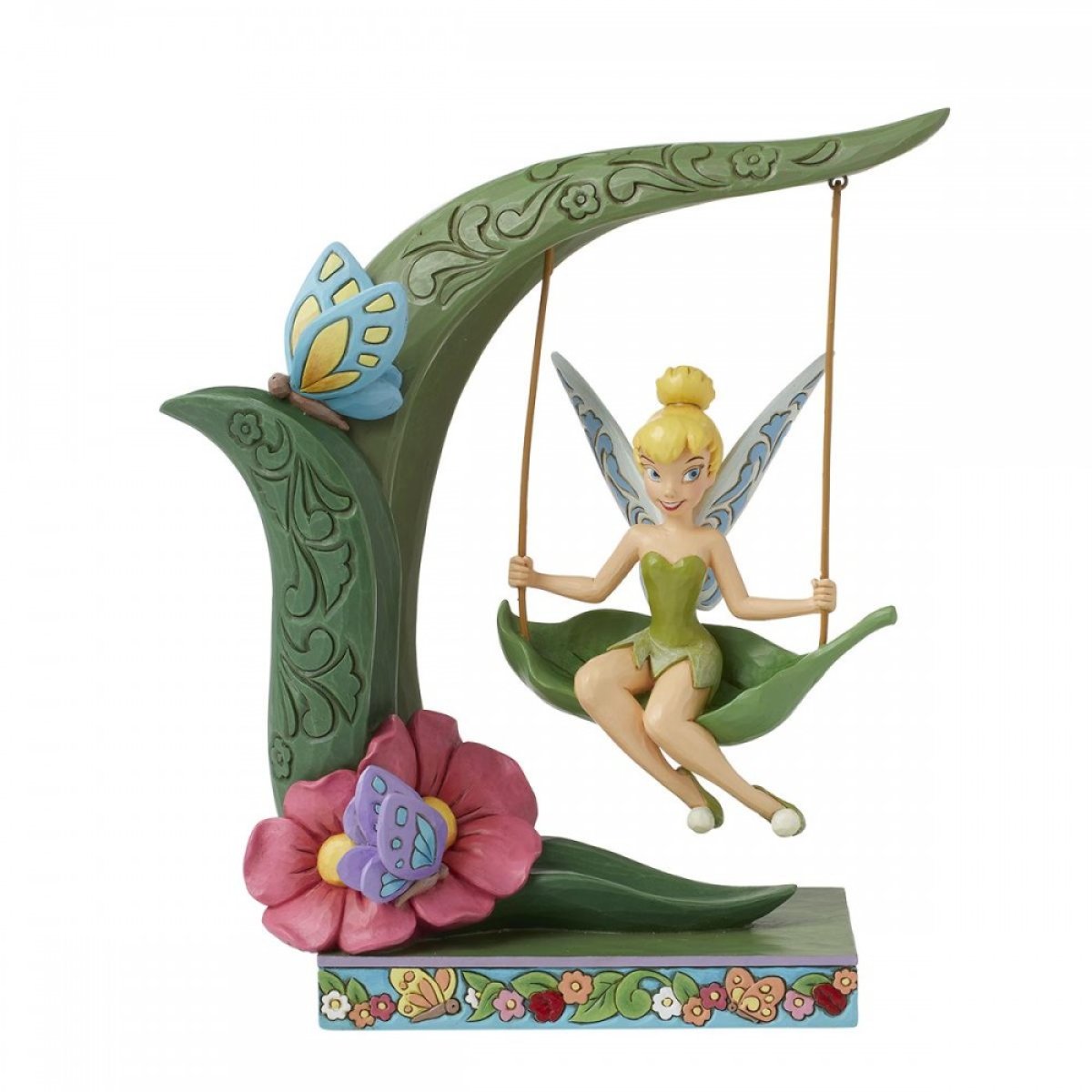 This figurine depicts Tinkerbell swinging in a flowery setting. Peter Pan's most iconic fairy has fun in this spring figure from the Disney Traditions collection by Jim Shore. Made and painted by hand, it comes in a gift box in the artist's colors.